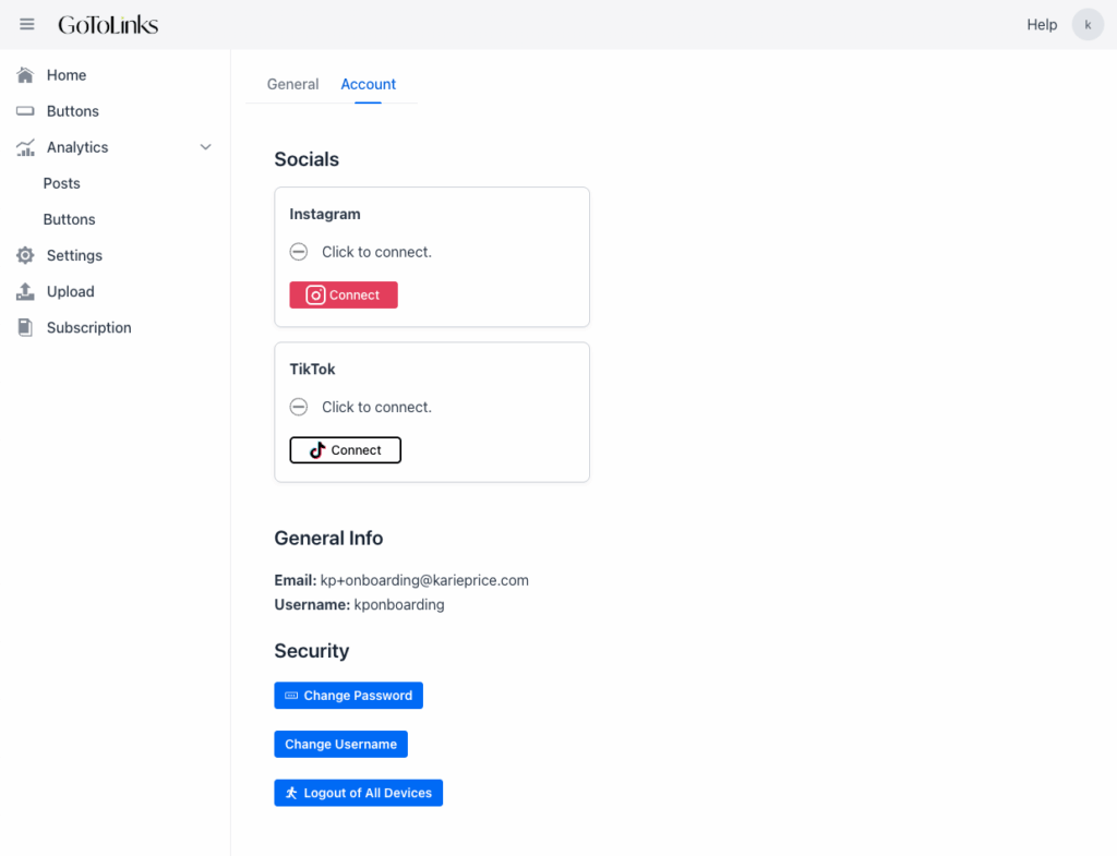- Click one of the Connect buttons and follow the platform’s screens for connecting your social media account with GoToLinks. Note: We do not have access to the login credentials for your social media account.